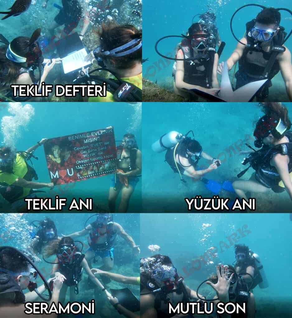 Çift Dalış Turu + Dalış Öncesi Tekne Kameraman + Deniz Altında Video Kameraman + Deniz Altı Fotoğrafcı + Deniz Altı Dalış Eğitimi + Yüzük Merasimi + Deniz Altında Çifte Özel Resimli ve Yazılı Afiş Açma + Tüm Görsellerin Profesyonel Youtube Klip halinde sunulması